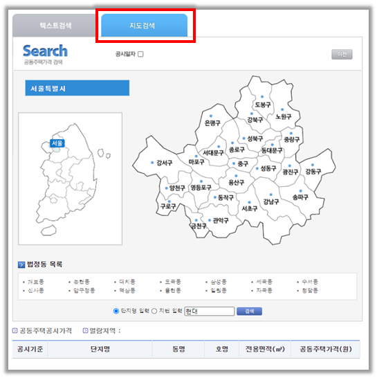 지도검색으로 조회하는 방법도 있습니다. '지도검색' 탭 클릭 후 시/군/구를, 법정동을 선택합니다. 그리고 단지명이나 지번을 입력하고 검색을 클릭합니다.