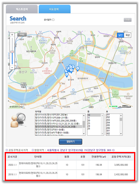 그러면 아래와 같이 지도가 표시됩니다. 마찬가지로 단지와 동/호수를 선택 후 열람하기 버튼을 클릭하면 해당 물건의 공시가격을 확인할 수 있습니다. 참고로 과거 공시가격 이력도 전부 확인할 수 있습니다.