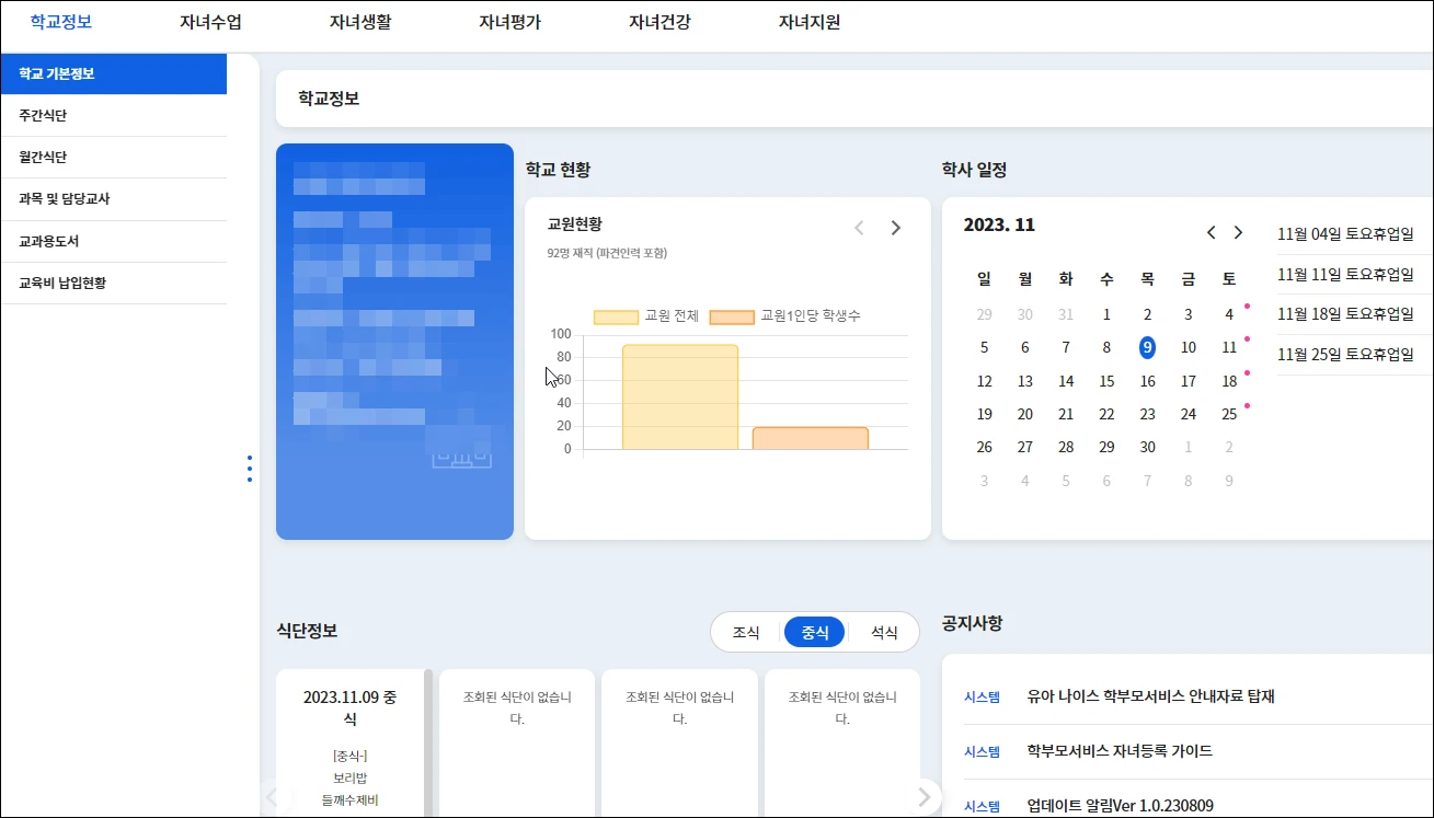 자녀 '학교정보' 메뉴로 가면 여러 가지 사항들을 알 수 있습니다. 학교 기본정보에서 선생님 숫자와 1인당 학생 수, 학사 일정, 식단 정보 등을 한눈에 확인할 수 있고요.