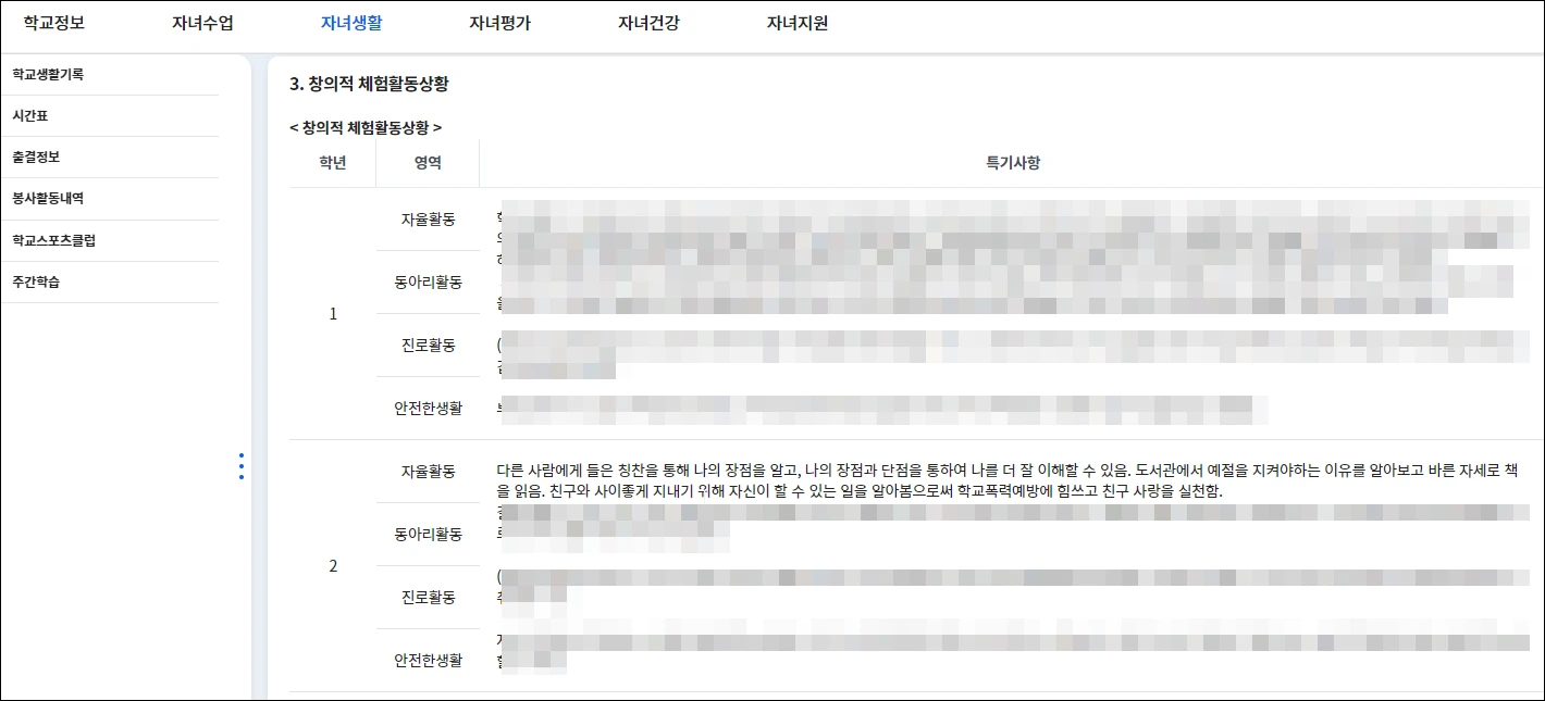 자녀 생활 메뉴에서는 학교 생활기록에 대한 내용을 확인할 수 있습니다. 기본적으로 출결 상황, 창의적 체험활동 상황 등을 살펴볼 수 있고요.