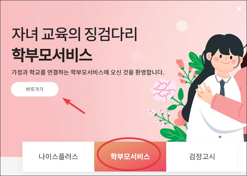 나이스 학부모 서비스를 이용하기 위해서는 우선 나이스 대국민 서비스 페이지로 이동해 '학부모서비스'를 선택하고 '바로가기' 버튼을 클릭합니다. 최근 홈페이지가 리뉴얼되면서 많이 예뻐졌네요.