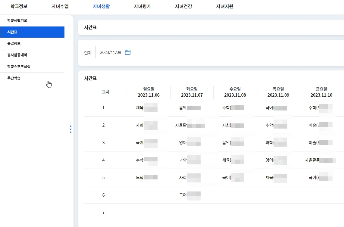 사이드 메뉴를 통해 주간 식단, 월간 식단, 과목 및 담당교사, 교과용 도서, 교육비 납입 현황 등도 좀 더 상세히 살펴볼 수 있습니다.