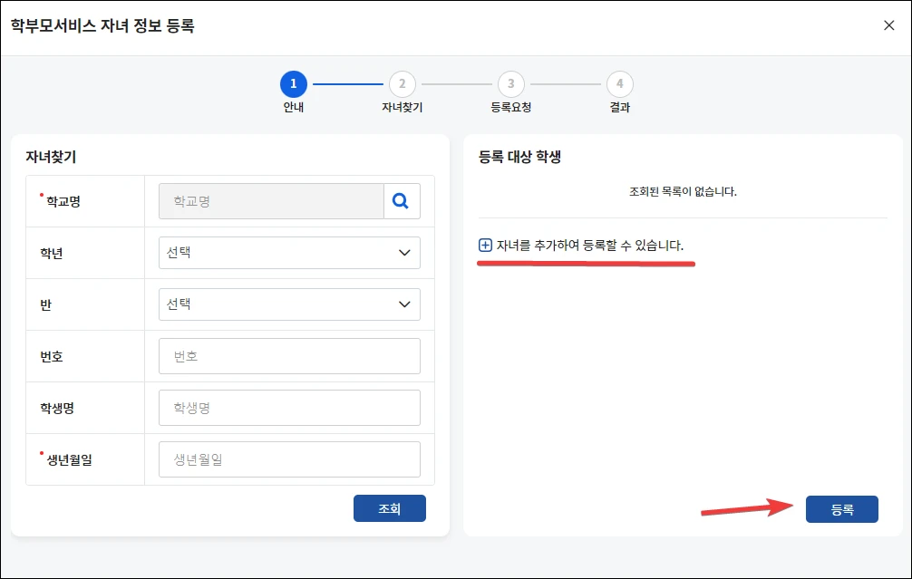 자녀 등록을 해야 하는데요. 기본적으로 반, 번호 등을 정확히 알아야 등록이 가능합니다. 자녀가 2명 이상인 경우 우측 플러스 버튼을 눌러 여러 명 추가할 수 있습니다.