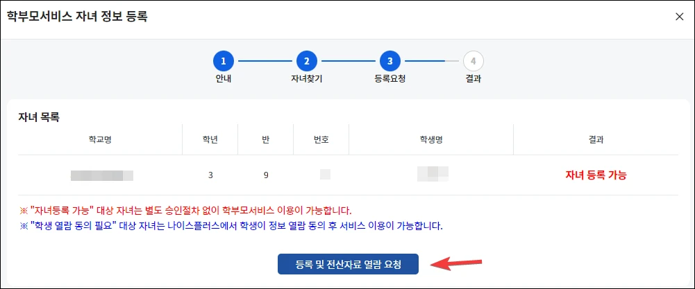 '자녀 등록 가능'이라고 뜬 경우 바로 '등록 및 전산자료 열람 요청'을 누르시면 돼요.