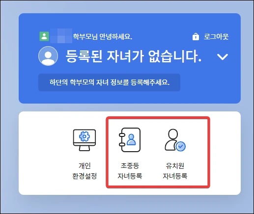 처음에는 자녀를 한 번 등록해야 합니다. 아이 학급에 맞게 등록 메뉴를 누르면 됩니다. 예전에는 유치원 자녀등록이 없었던 것 같은데 새로 생긴 것 같네요.