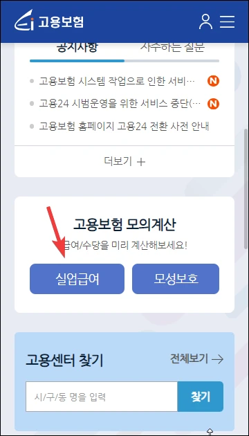 먼저 고용보험 홈페이지에 들어가서, 아래로 조금 스크롤한 뒤, '고용보험 모의계산 > 실업급여' 버튼을 선택합니다.