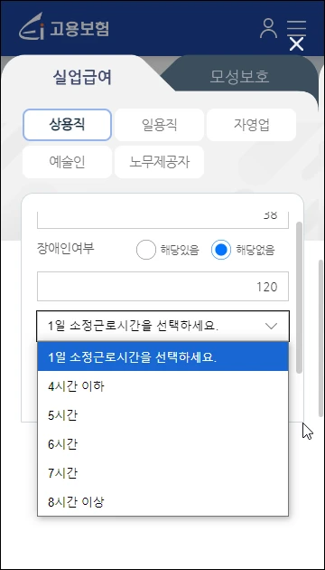 상용직, 일용직, 자영업, 예술인, 노무 제공자 등 실직 전 근무형태를 선택합니다.