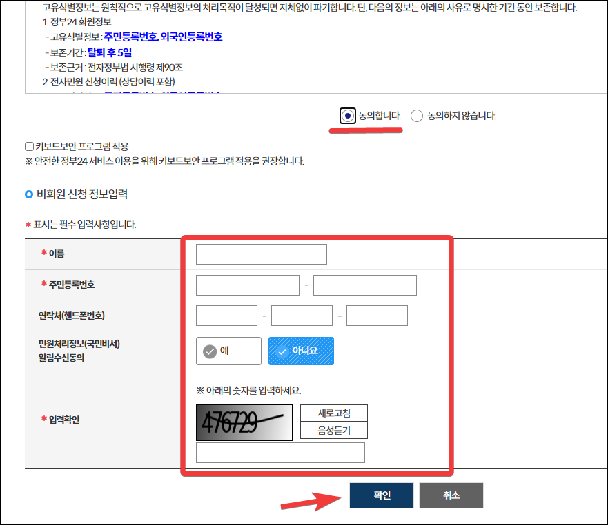 비회원으로 들어갈 경우 간단한 개인 정보 입력을 해야 합니다. 개인정보 수집/이용/제공 등에 동의한 뒤 이름, 주민등록번호 등을 입력하고 다음 단계로 넘어 갑니다.