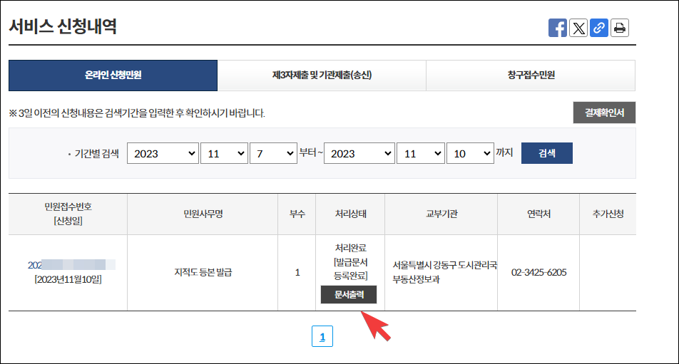 서비스 신청내역에 내가 신청한 민원 리스트가 보이는데요. '문서 출력'을 눌러 지적도를 확인할 수 있습니다.